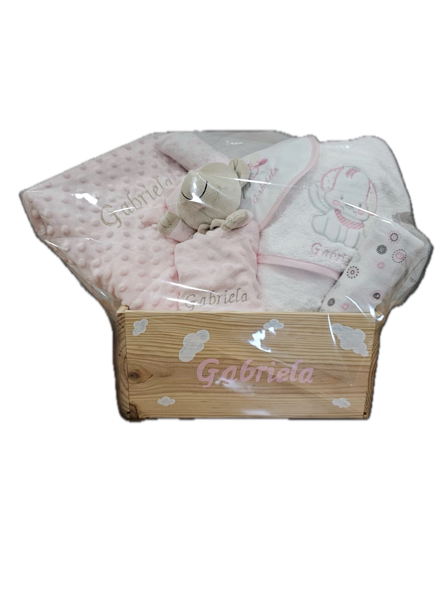 • 1 caja de madera con el nombre del bebé pintado a mano. Medidas de la caja 40x30x14 cm.