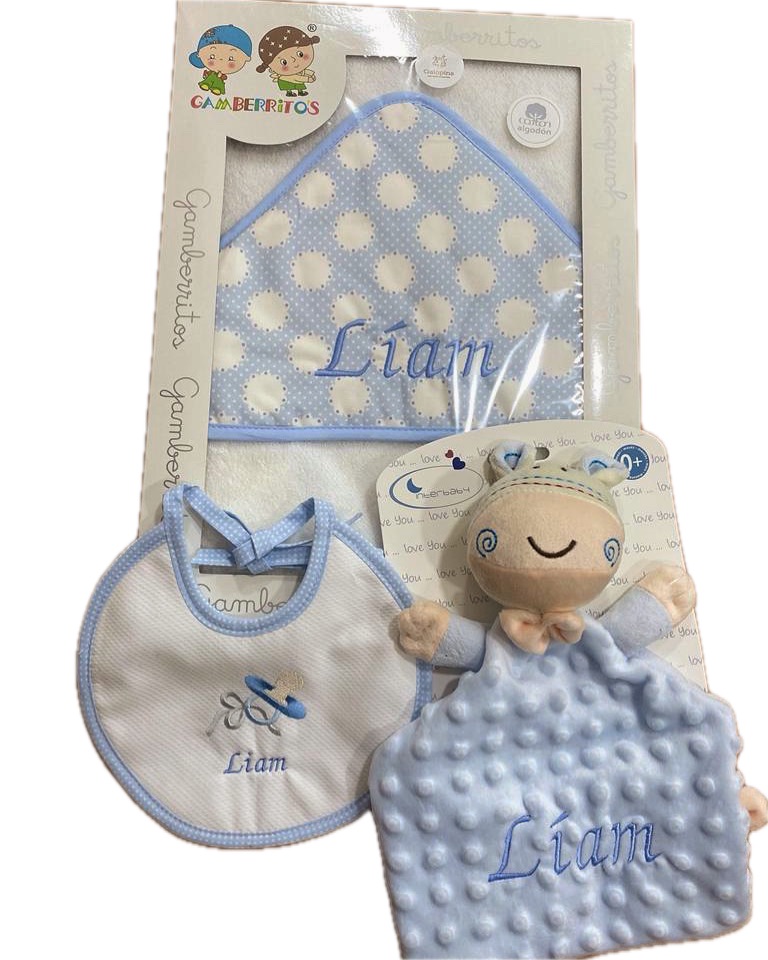 • 1 capa de baño bordada con el nombre del bebé. 100% algodón, 100x100cm.