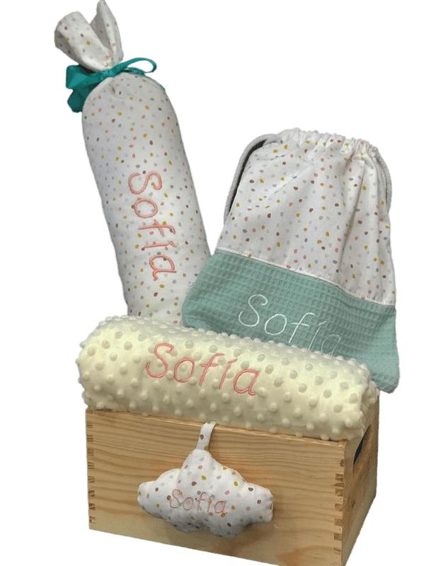 • 1 caja de madera con el nombre del bebé pintado a mano. Medidas de la caja 40x30x14 cm.