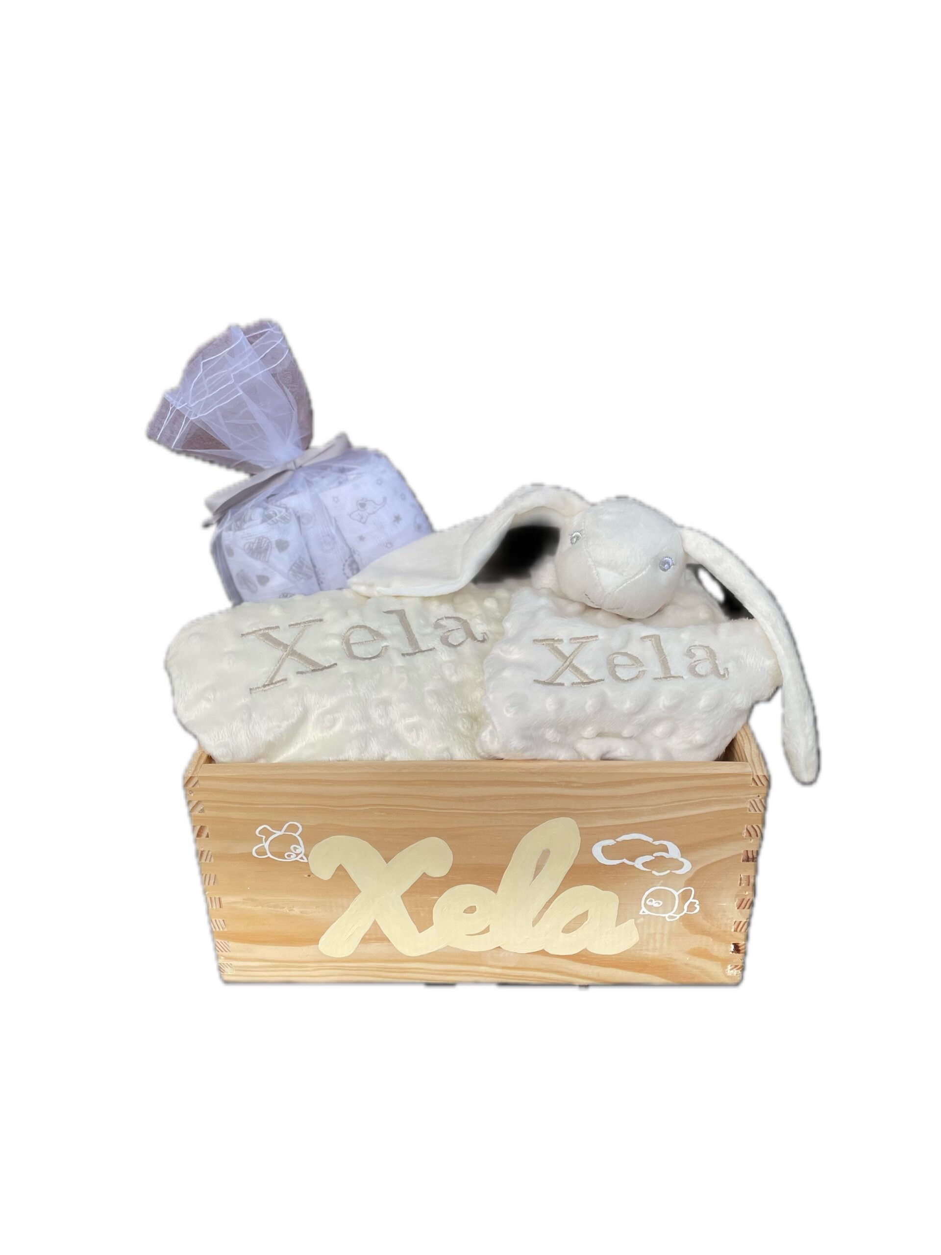 • 1 caja de madera con el nombre del bebé pintado a mano. Medidas de la caja 40x30x14 cm